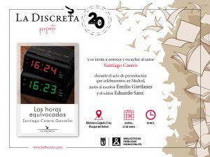 La Discreta comienza fuerte el 2019, año que celebra su vigésimo aniversario de existencia. Si hace unos días presentaba el poemario La conducta del soñador, de Ramón de la Vega, próximamente presentará Las horas equivocadas, libro de relatos de Santiago Casero. La presentación tendrá lugar el martes 22 de enero, a las 19 horas, en la Biblioteca Eugenio Trías (Paseo Fernán Núñez, 24), en el Retiro madrileño, antigua Casa de Fieras. En el acto, el autor estará acompañado por el también escritor Emilio Gavilanes, y el editor del libro, Eduardo Sanz.
